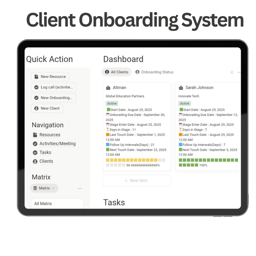 - Pre-built task templates — every new client gets the same onboarding steps, instantly.